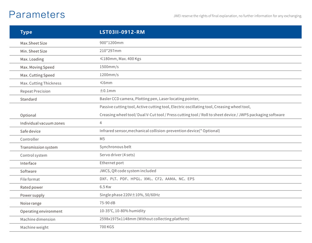 JWEI LST03II-0912-RM je opremljen z rezalnim orodjem, s kolesom za pregibanje in sistemom za registracijo CCD. Serija LST03II digitalno reže nalepke vseh oblik in zložljiv karton različnih struktur, do višine 6 mm. Serija je visoko avtomatizirana s funkcijo prepoznavanja QR kode za samodejno branje in pridobivanje rezalne datoteke. Za dokončanje rezanja formata v velikosti 900mm x 1200mm je potrebno le nekaj sekunda, vse je odvisno od zahtevnosti oblike.